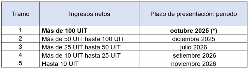 Cabe indicar que en total serán más de 587 mil personas jurídicas domiciliadas y 23,248 entes jurídicos constituidos en el país quienes deberán presentar esta declaración de manera progresiva, hasta el periodo noviembre 2026, según lo dispuesto en la Resolución de Superintendencia N.º 168-2025/SUNAT, tal como se muestra en el siguiente cuadro: