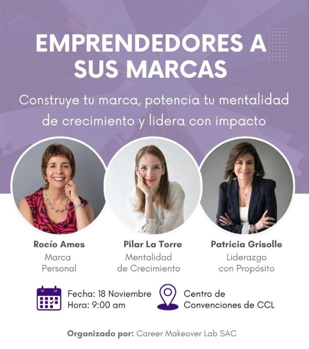 La conferencia “Emprendedores a sus marcas”, organizada por Career Makeover Lab SAC, se llevará a cabo el martes 18 de noviembre a las 9:00 a.m. en la sala Rómulo Ferrero 1 del Centro de Convenciones de la Cámara de Comercio de Lima (CCL). El encuentro está dirigido a profesionales, emprendedores y líderes que buscan fortalecer su presencia personal y profesional en un entorno empresarial competitivo.
