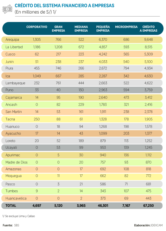 Al otro extremo, el crédito corporativo es nulo en siete departamentos del país, Huancavelica, Pasco, Moquegua, Amazonas, Madre de Dios y Apurímac. Así como el crédito a la gran empresa en Huancavelica.
