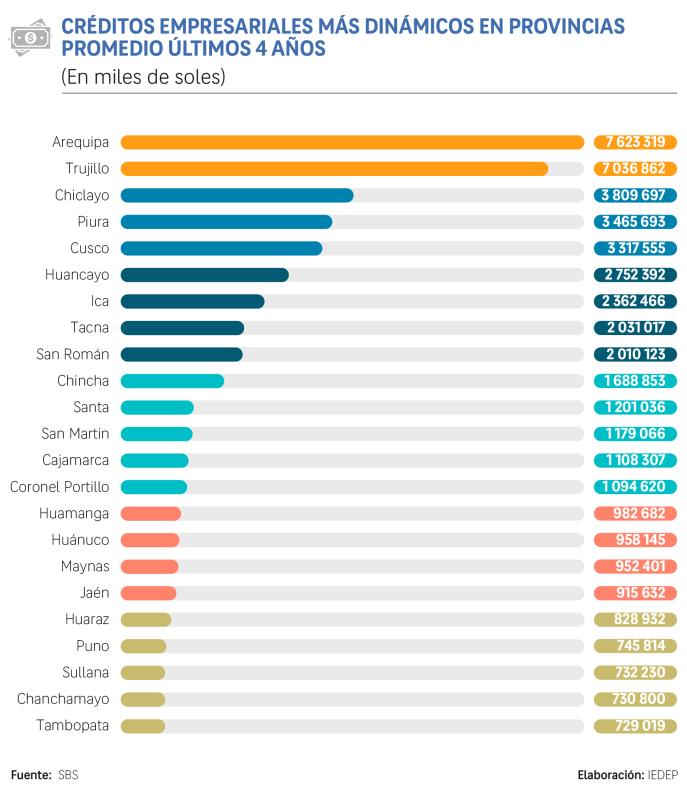 Fuera de Lima y Callao, la dinámica del crédito empresarial se vuelve particularmente interesante. Ciudades como Arequipa y Trujillo con una demanda crediticia robusta superan los S/ 7 000 millones en colocaciones promedio en los últimos cuatro años. En un segundo grupo, Chiclayo, Piura y Cusco alcanzan los S/ 3 500 millones anuales, impulsados principalmente por sectores clave como la agroindustria, el comercio y el turismo. Por último, un tercer grupo está formado por Huancayo, Ica, Tacna y San Román, con montos que no superan los S/ 3 000 millones.