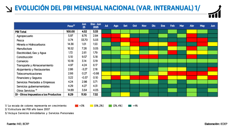 En junio, la economía peruana creció 4.5 % interanual, cerrando el primer semestre con una expansión acumulada de 3.3 %. Con ello, la actividad productiva nacional completó 15 meses consecutivos de resultados positivos.