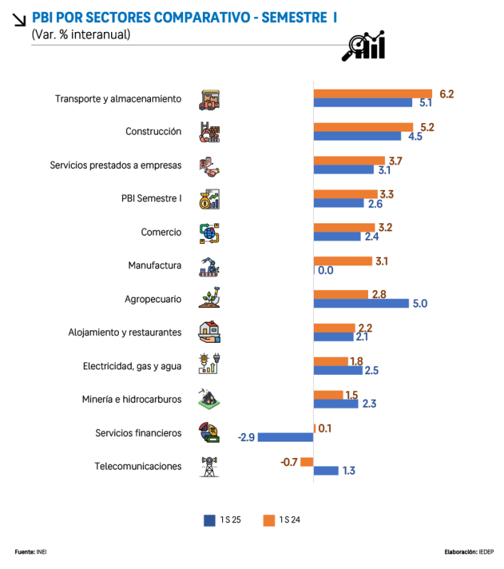 En contraste, otros sectores crecieron a un ritmo menor que en 2024 como son Electricidad, gas y agua (1.8%), Minería e hidrocarburos (1.5%) y Telecomunicaciones (-0.7%).