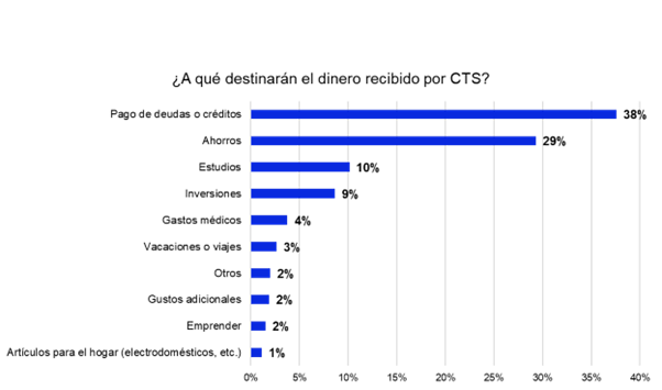 Según el estudio Compensación por Tiempo de Servicios (CTS) de Bumeran, el 38 % de las personas trabajadoras destina esta compensación al pago de deudas o créditos. Además, el 29 % planea ahorrar ese dinero, mientras que el 10 % lo invertirá en estudios para su crecimiento profesional.