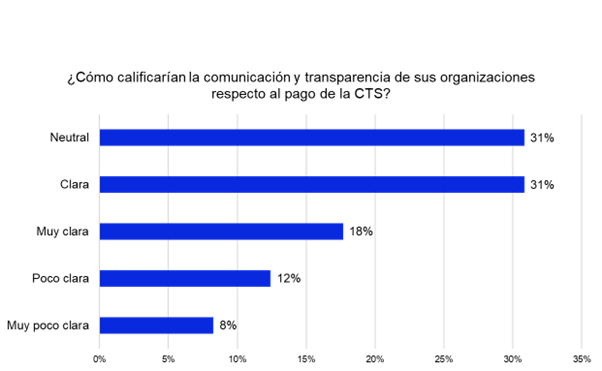 ¿Cómo califican la comunicación y transparencia en el pago de la CTS? El 31 % califica de manera neutral la comunicación y la transparencia; otro 31 % considera que es clara; el 18 % señala que es muy clara; el 12 % indica que es poco clara; y el 8 % menciona que es muy poco clara.