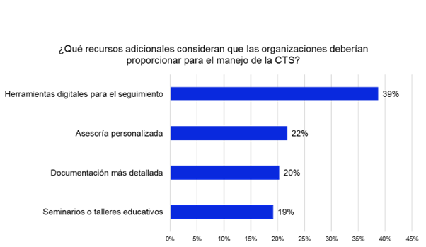 ¿Qué recursos adicionales consideran los talentos que la organización debería proporcionar para el manejo de la CTS? El 39 % sugiere implementar herramientas digitales para el seguimiento; el 22 % asesoría personalizada; el 20 % una documentación más detallada; y el 19 % recomienda seminarios o talleres educativos.