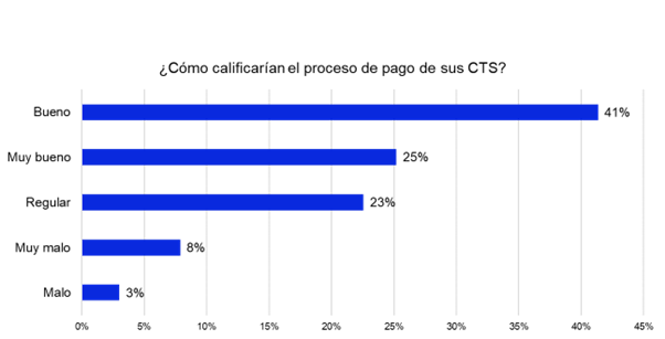 ¿Cómo califican el proceso de pago del beneficio de CTS? El 66 % califica el proceso como «bueno» y «muy bueno»; el 23 % regular; y el 11% lo califica “malo” y “muy malo”.
