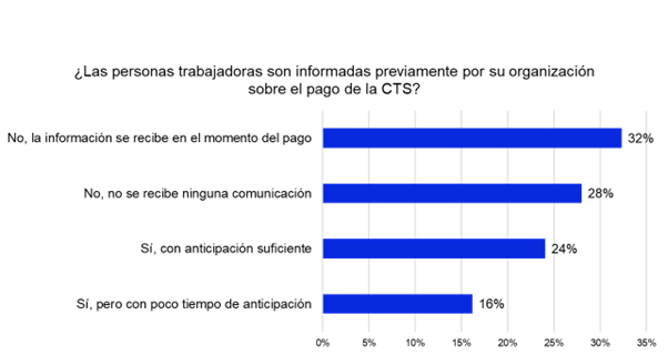 ¿Las personas trabajadoras son informadas previamente sobre el pago de la CTS? El 32 % de los talentos reporta que son informadas sobre la CTS en el momento del pago; el 28 % no recibe ninguna comunicación al respecto; el 24 % recibe información con anticipación; y el 16 % recibe información, pero con poco tiempo de anticipación.