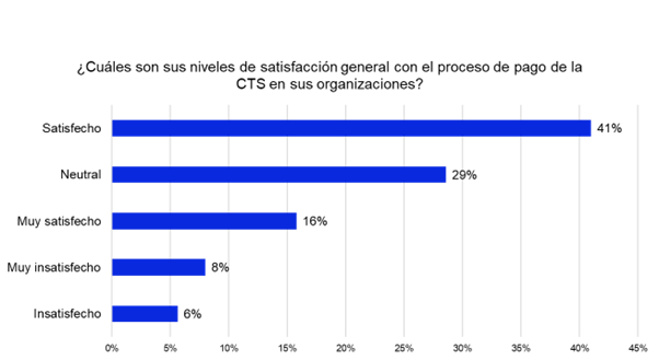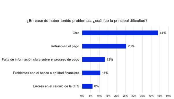 El 26 % de las personas trabajadoras indica que la principal dificultad que ha experimentado frente al pago de la CTS ha sido el retraso de sus pagos en los últimos años; el 13 % señala la falta de información clara sobre el proceso; el 11 % expresa problemas con el banco o entidad financiera; y el 6 % indica errores en el cálculo de la CTS.