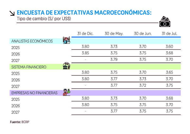 Cabe indicar que los diferentes analistas económicos consultados por el BCRP para su Encuesta de Expectativas Macroeconómicas han mantenido una tendencia a la baja en sus proyecciones para fin de año. Así, en diciembre de 2024 proyectaban un dólar de 3.80 soles para diciembre de 2025, pero en julio (última publicación) ya estimaban entre 3.6 y 3.68; estimación que habría seguido disminuyendo.