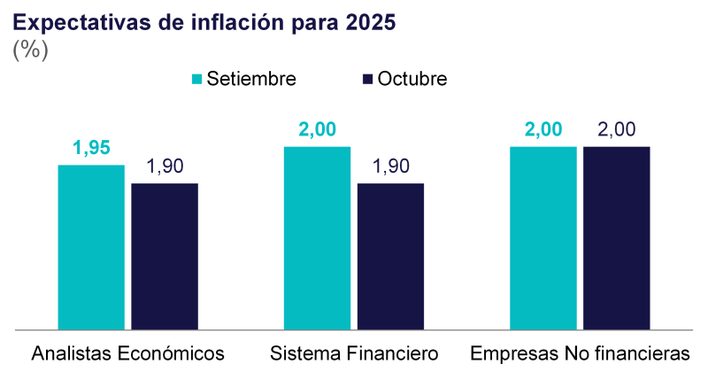 Para 2025, los analistas económicos redujeron su proyección de inflación de 1.95 % a 1.90 % entre setiembre y octubre, y el sistema financiero la redujo de 2.00 % a 1.90 % entre ambos meses; en tanto que las entidades no financieras las mantuvieron en 2.00 %.