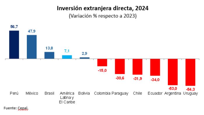 Según el último reporte de la Comisión Económica para América Latina y el Caribe (CEPAL) titulado “La Inversión Extranjera Directa en América Latina y el Caribe 2025”, Perú figura como el país con el mayor crecimiento de inversión extranjera directa (IED) en la región durante 2024.
