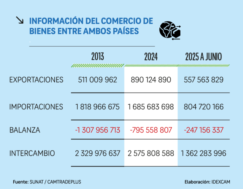 Entre enero y junio de este año, el intercambio bilateral de bienes y servicios alcanzó los 1 362 millones de dólares con una balanza favorable a México de 247 millones de dólares, pero con exportaciones peruanas cada vez más dinámicas, según datos de Sunat y de CAMTRADEPLUS.