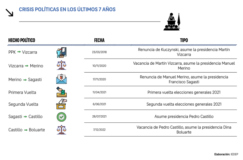 Los acontecimientos políticos pueden provocar efectos significativos en la economía, particularmente en indicadores de corto plazo. En el caso del Perú, la economía ha atravesado en los últimos años una serie de episodios que es interesante medir su impacto. Este análisis abarca el periodo comprendido entre la renuncia del expresidente Pedro Pablo Kuczynski y la vacancia del expresidente Pedro Castillo, considerando los eventos más relevantes ocurridos de manera cronológica.