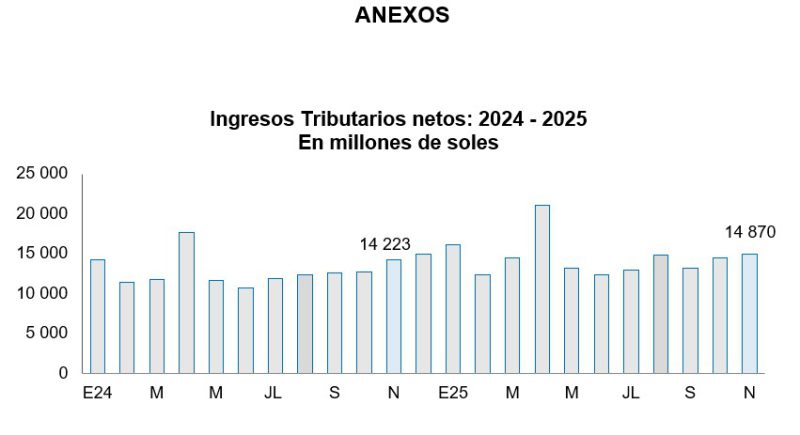 Los ingresos tributarios netos del gobierno central (descontando las devoluciones de impuestos) alcanzaron los S/ 159 496 millones entre enero y noviembre de 2025, cifra que representa un crecimiento acumulado de 11,5 % y de S/ 18 611 millones adicionales a lo registrado en el mismo periodo el año pasado. Asimismo, dicho monto ya ha superado a los S/ 155 756 millones recaudados durante todo el 2024.