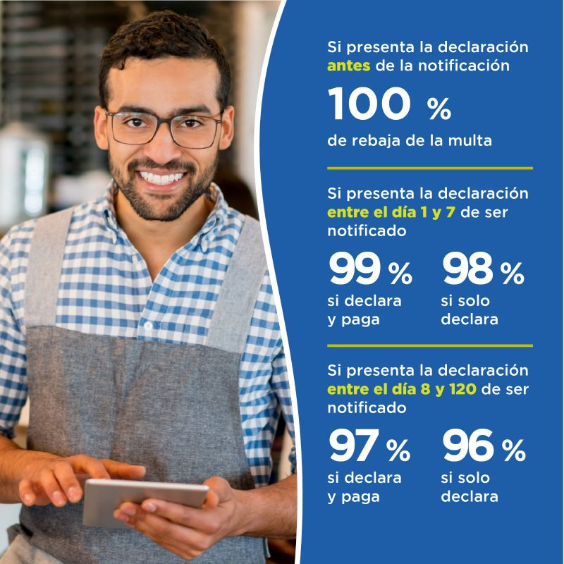 - Si presenta la declaración antes de que surta efecto la notificación de la multa, accederá a una rebaja del 100 %.