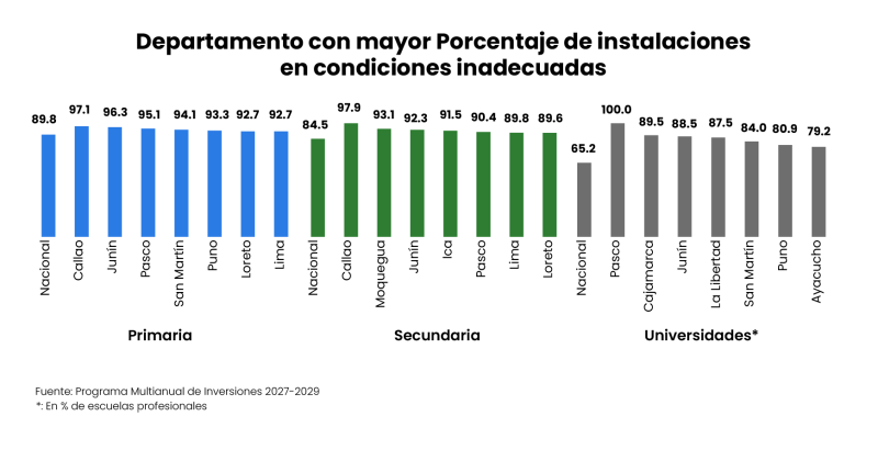 A ello se suma el deterioro de la infraestructura educativa, uno de los mayores desafíos que deberá enfrentar el próximo gobierno. El Programa Multianual de Inversiones 2027–2029 evidencia una situación crítica: a nivel nacional, el 89.8 % de los locales de educación primaria —equivalente a 26 919 instituciones— opera en condiciones inadecuadas. En secundaria, la brecha alcanza el 84.5 % (8 701 locales), mientras que en el sistema universitario el 65.2 % de las escuelas profesionales presenta deficiencias que afectan directamente la calidad del servicio educativo. Esta precariedad estructural se traduce en menores aprendizajes y profundiza las desigualdades territoriales.