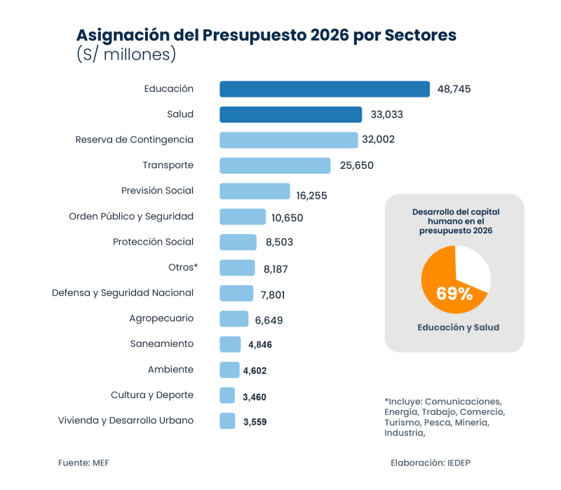 Si bien Educación (S/ 48 745 millones) y Salud (S/ 33 033 millones) representan en conjunto el 31 % del presupuesto total. La interrogante que surge es si esto montos asignados permiten avanzar en el cierre de brechas o solo sostienen la conducción en automático.